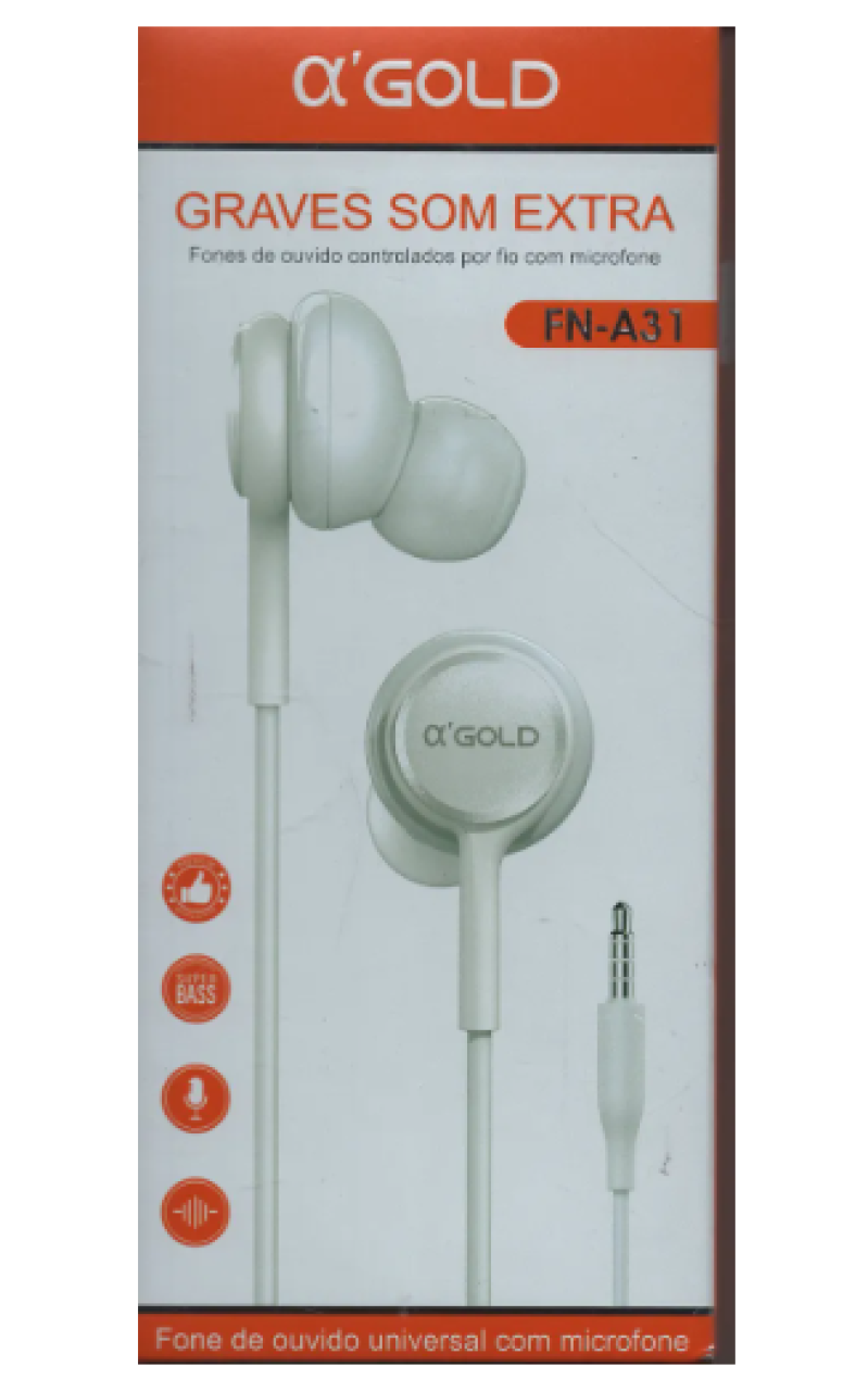 O fone de ouvido FN-A31 (ou A'Gold FN-A31) é um modelo intra-auricular com fio, destacando-se por graves potentes e som estéreo nítido. Possui microfone integrado, conector P3 de 3.5mm (compatível com celulares, PC e games) e cabo revestido em TPU de 1,2m, ideal para uso diário, trabalho e chamadas.
