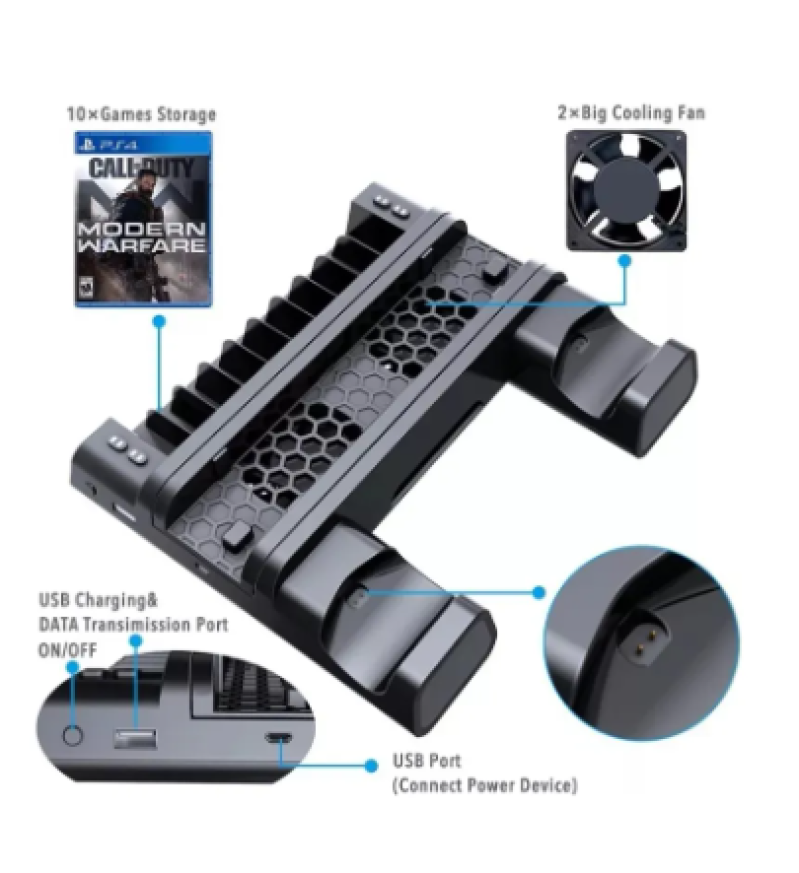 O Suporte Vertical com Cooler para PS4 (frequentemente chamado de Cooling Stand ou Base Multifuncional) é um acessório projetado para otimizar o espaço e a temperatura do console, além de centralizar o carregamento de acessórios.